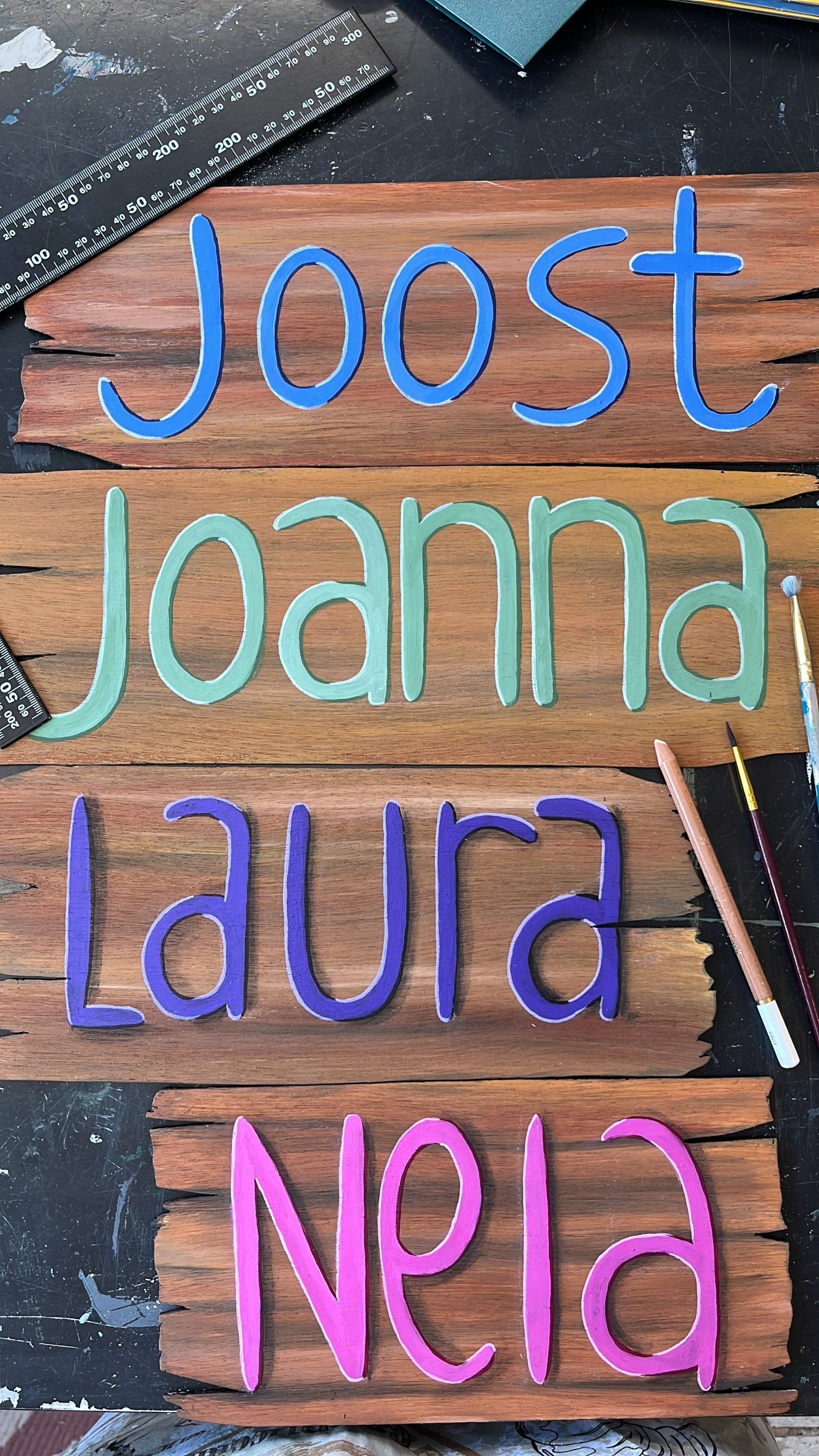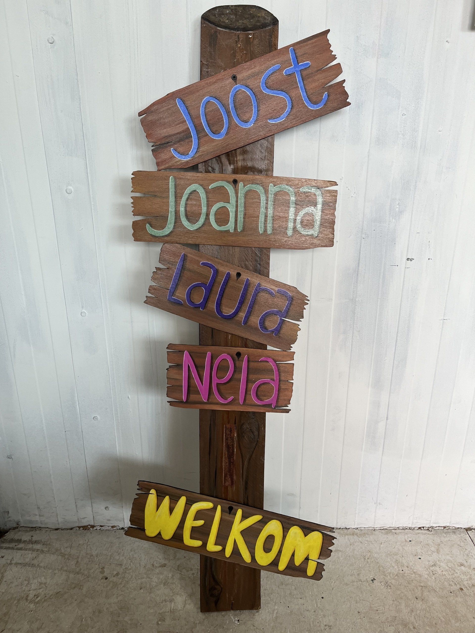 Dit WelkomstBord is in opdracht van een klant gemaakt! Ze heeft hier goed over nagedacht en wilde een bord, maar dan met de namen van haar gezin erop in vrolijke kleuren!
