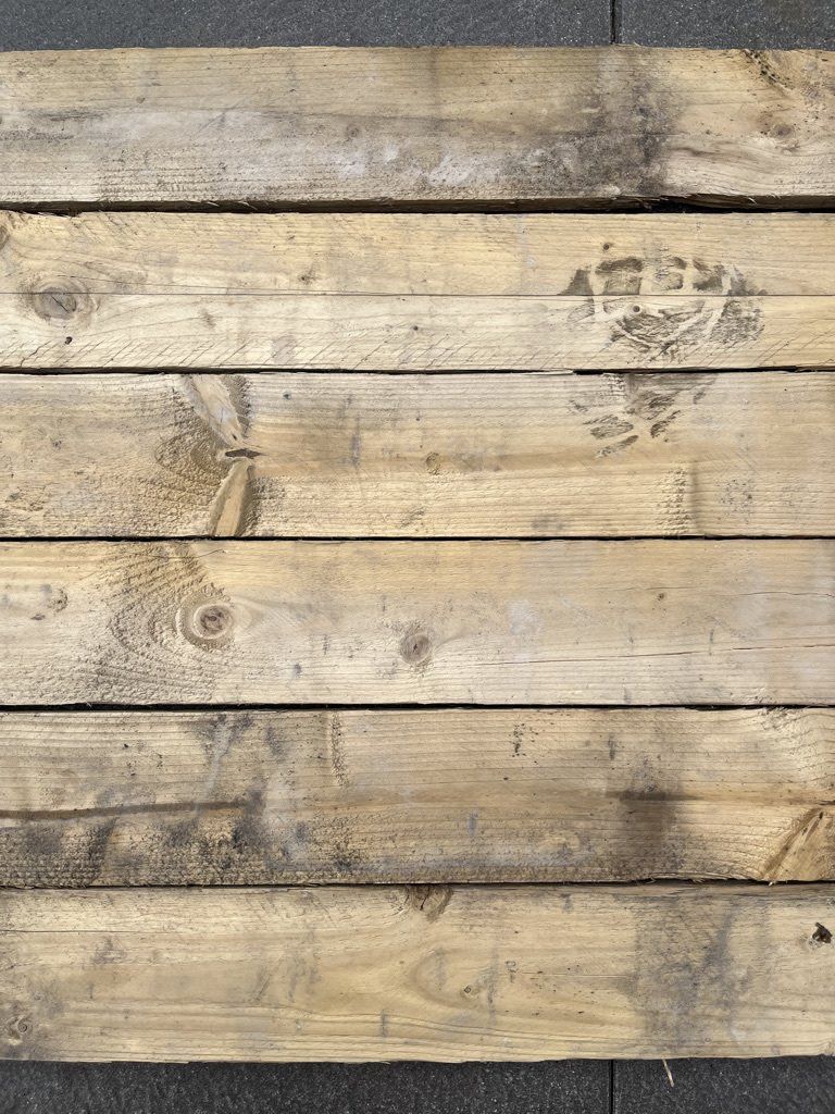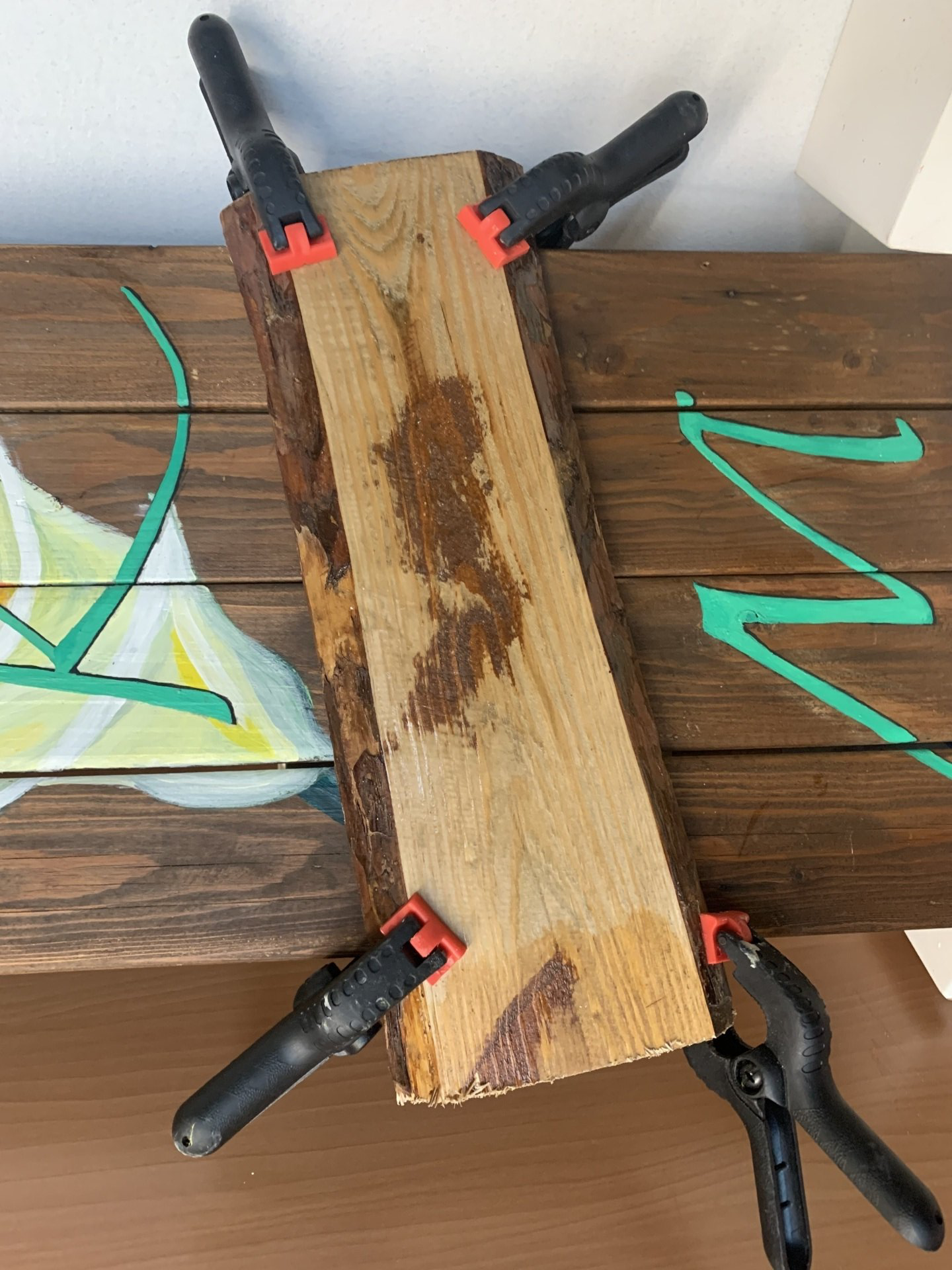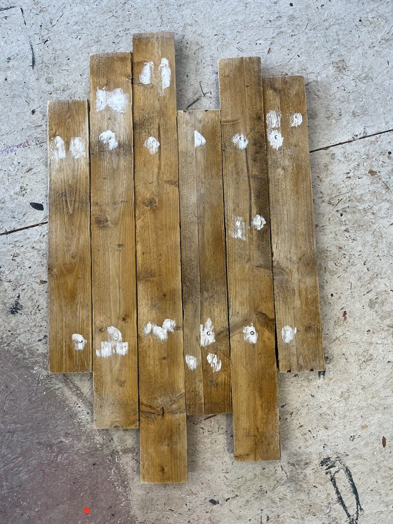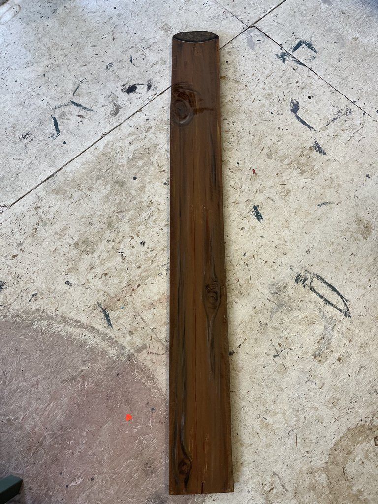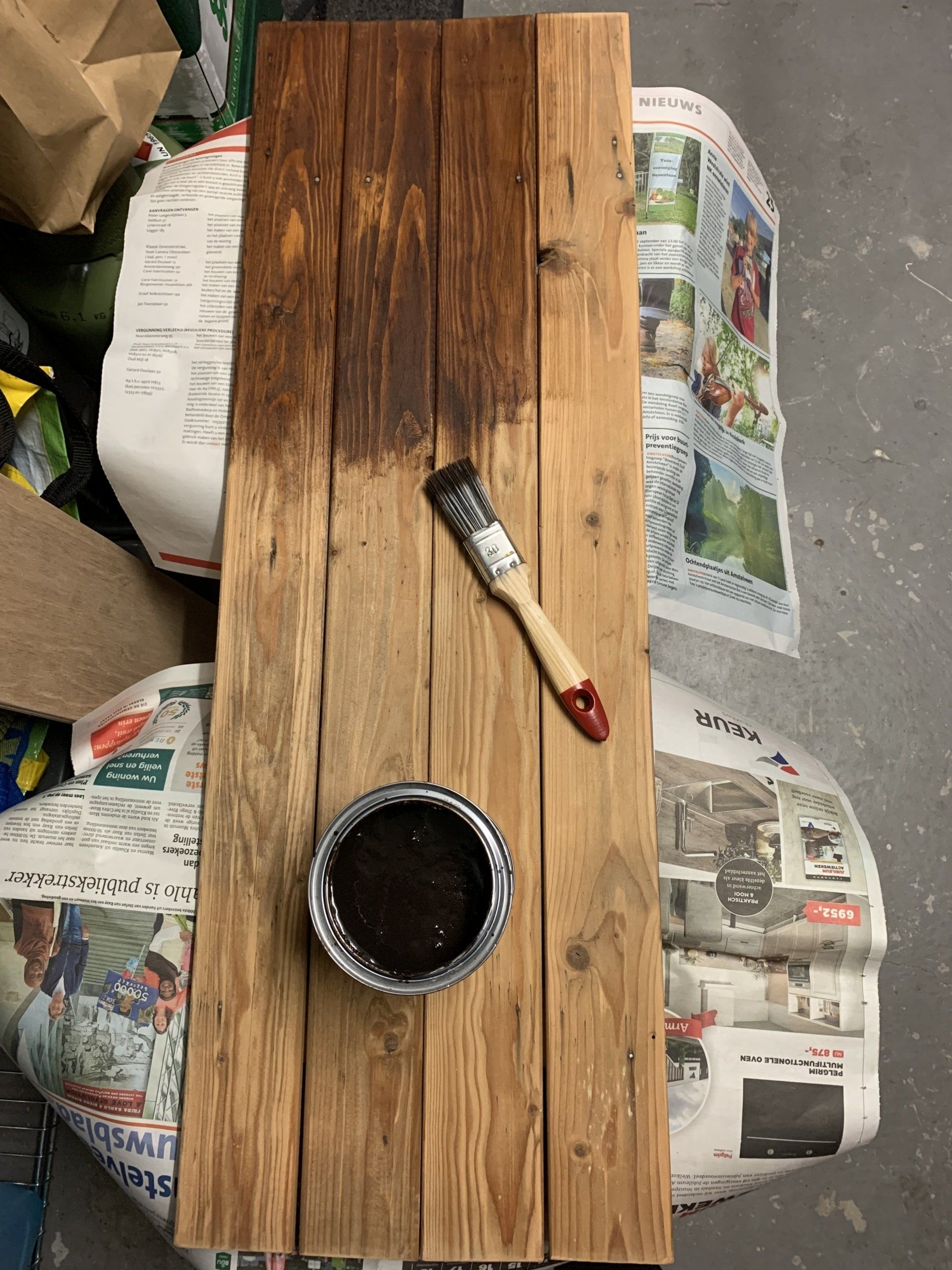 Allereerst wordt de gerecyclede plank opgeschuurd en in de beits gezet