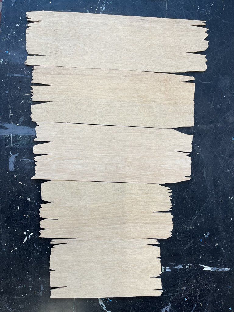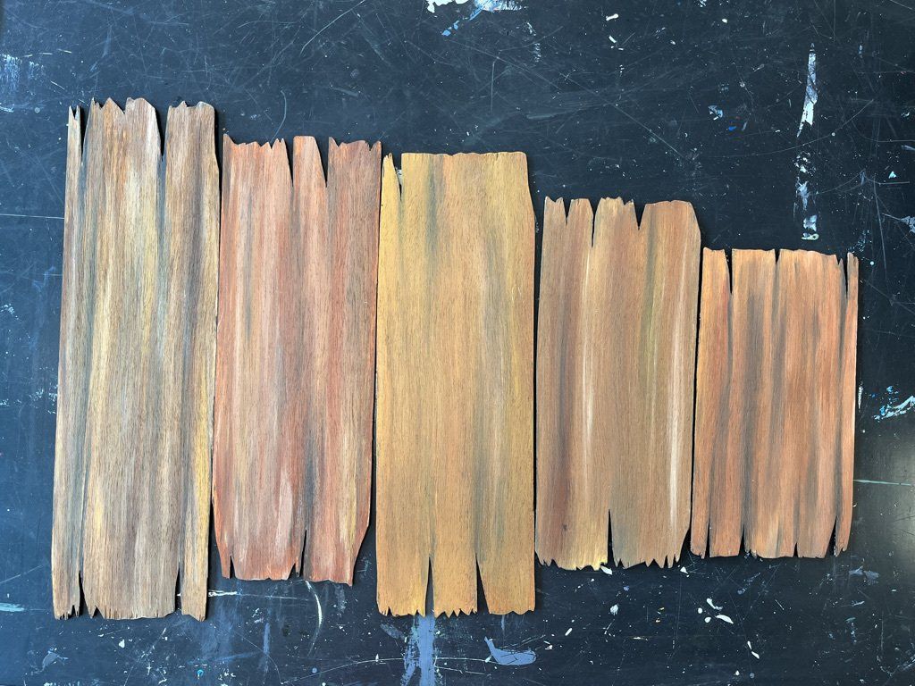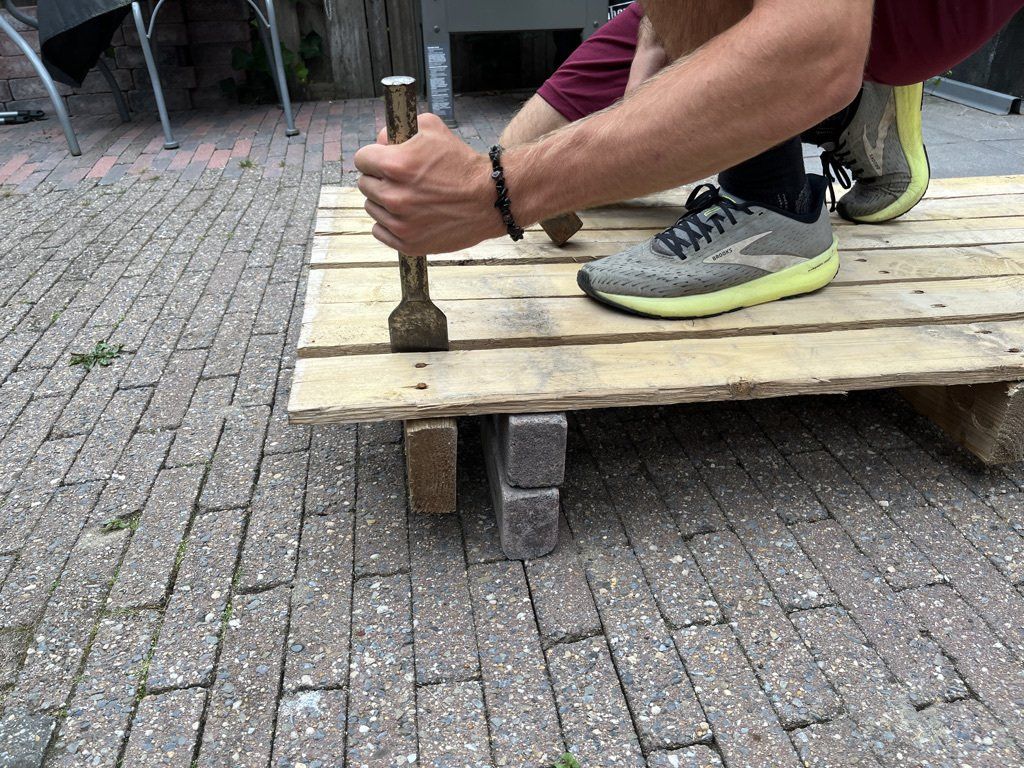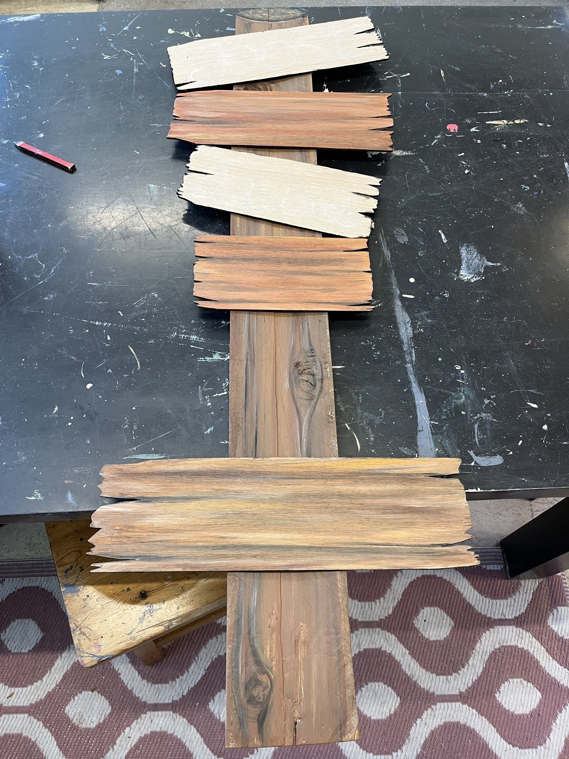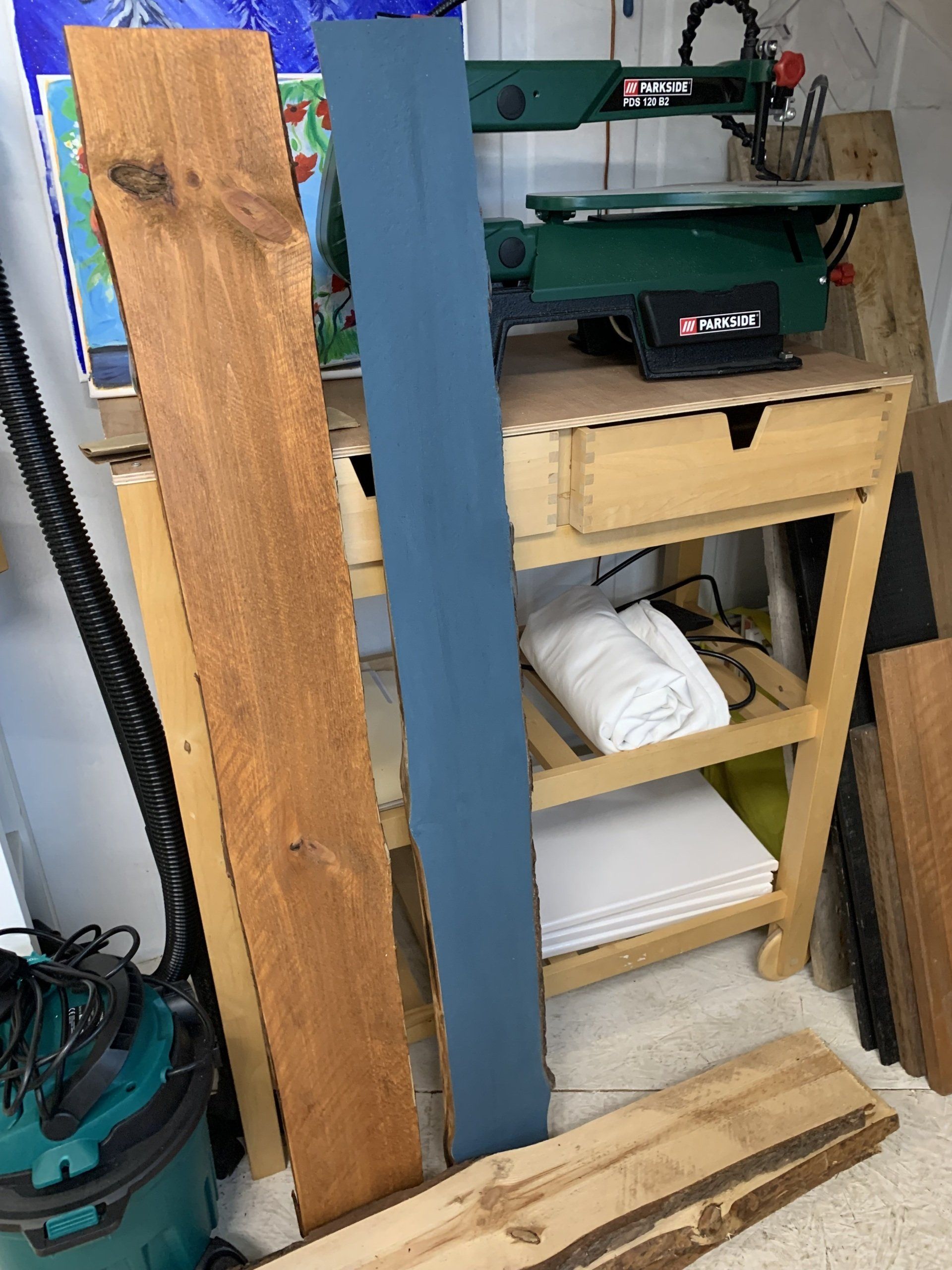 Allereerst wordt de gerecyclede plank opgeschuurd en in de beits gezet