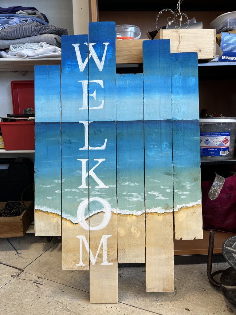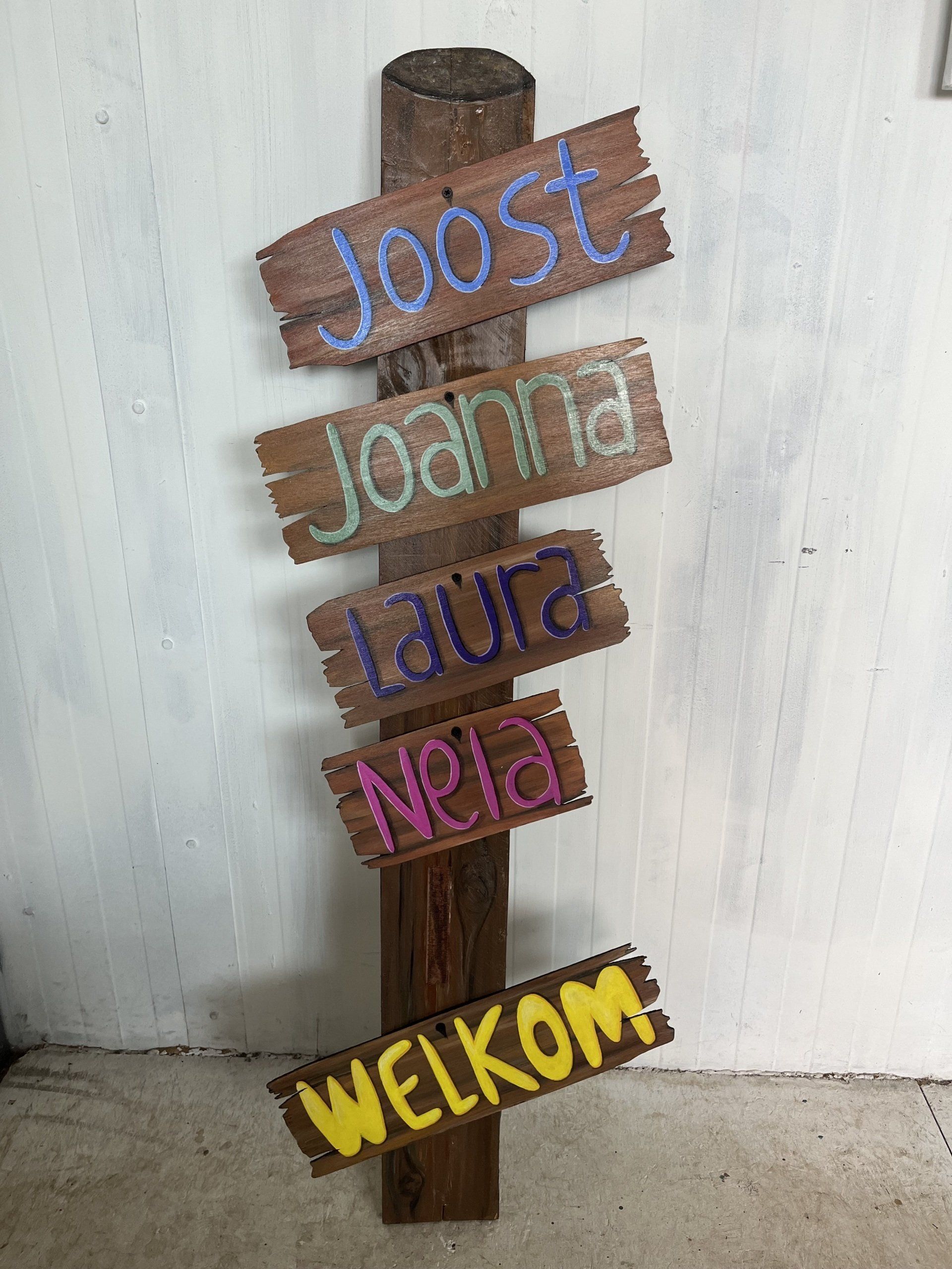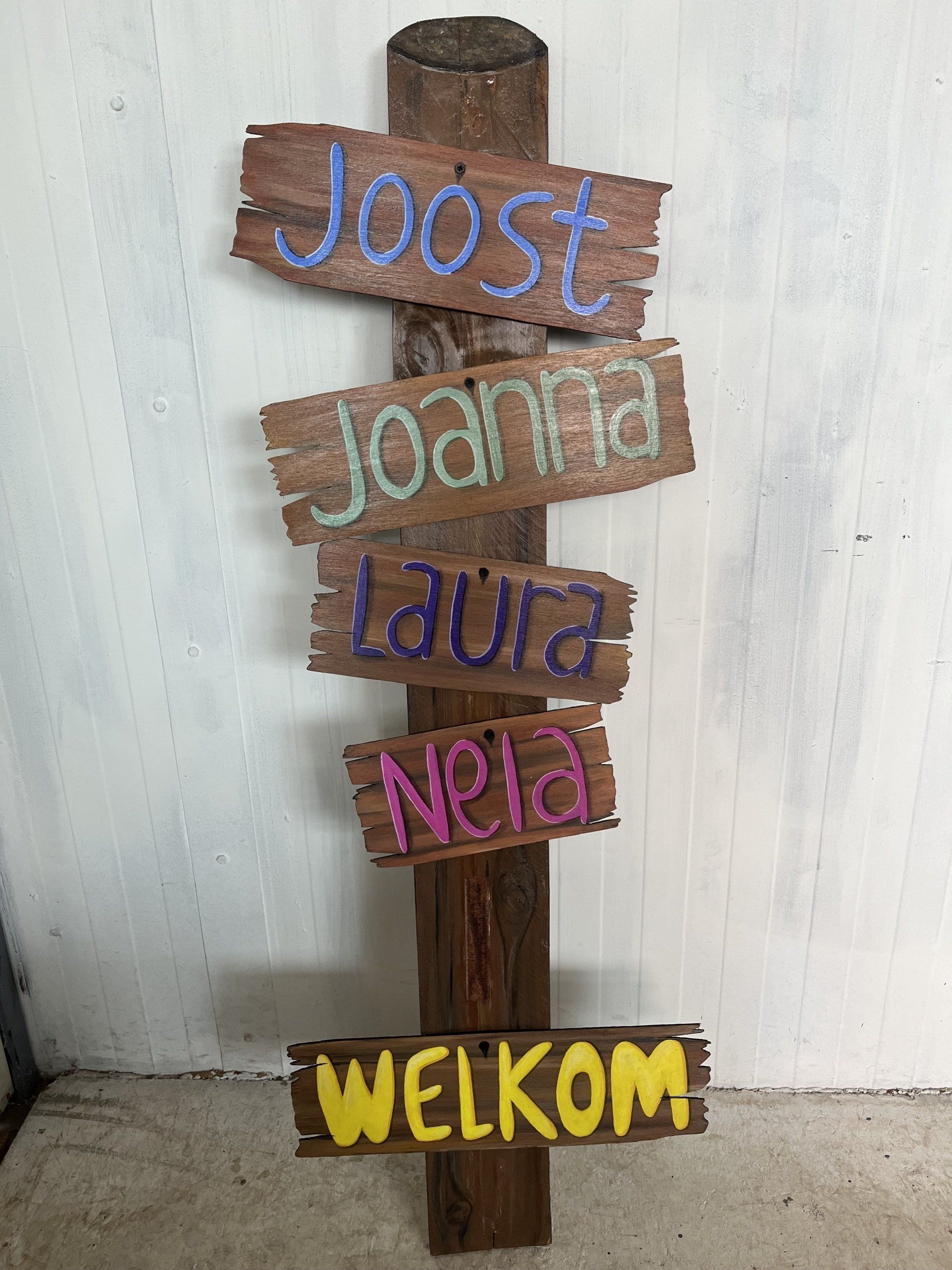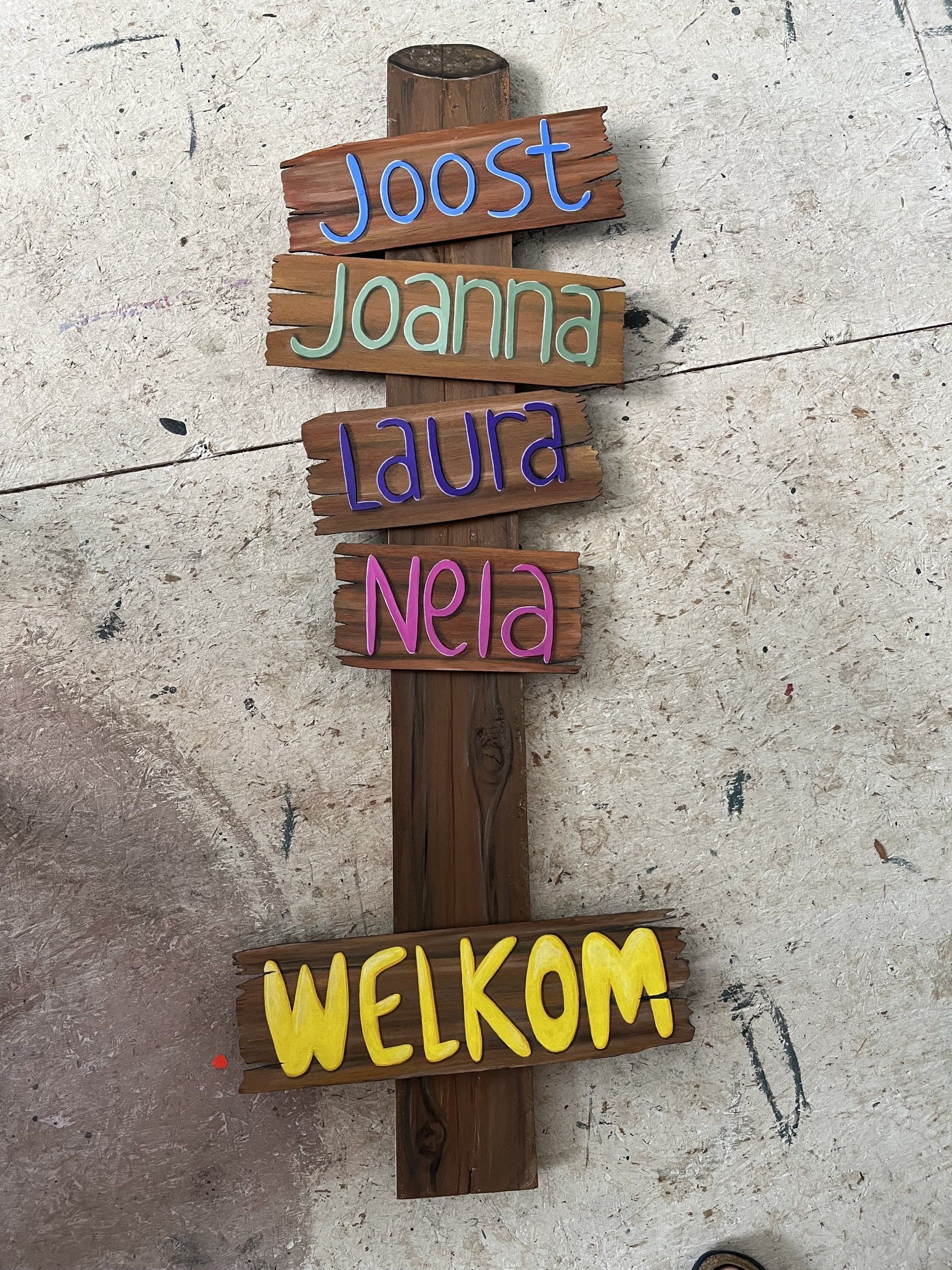 Na intensief overleg was het idee geboren om een soort van strandpaal te schilderen op het welkomstbord en de naambordjes erop te schroeven. Onderaan komt dan het bordje met WELKOM en daar tussen in een plekje om de wisselbordjes op te zetten. Want daar keken de kinderen helemaal naar uit!