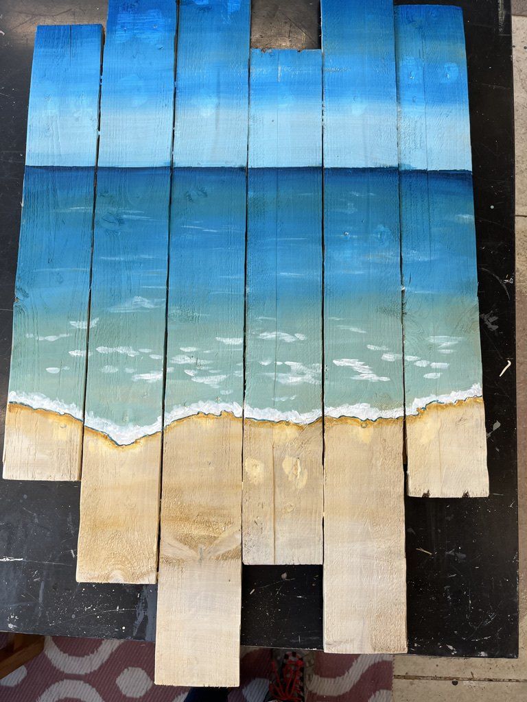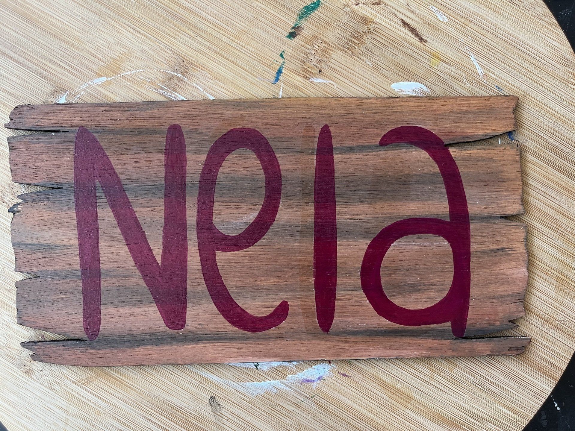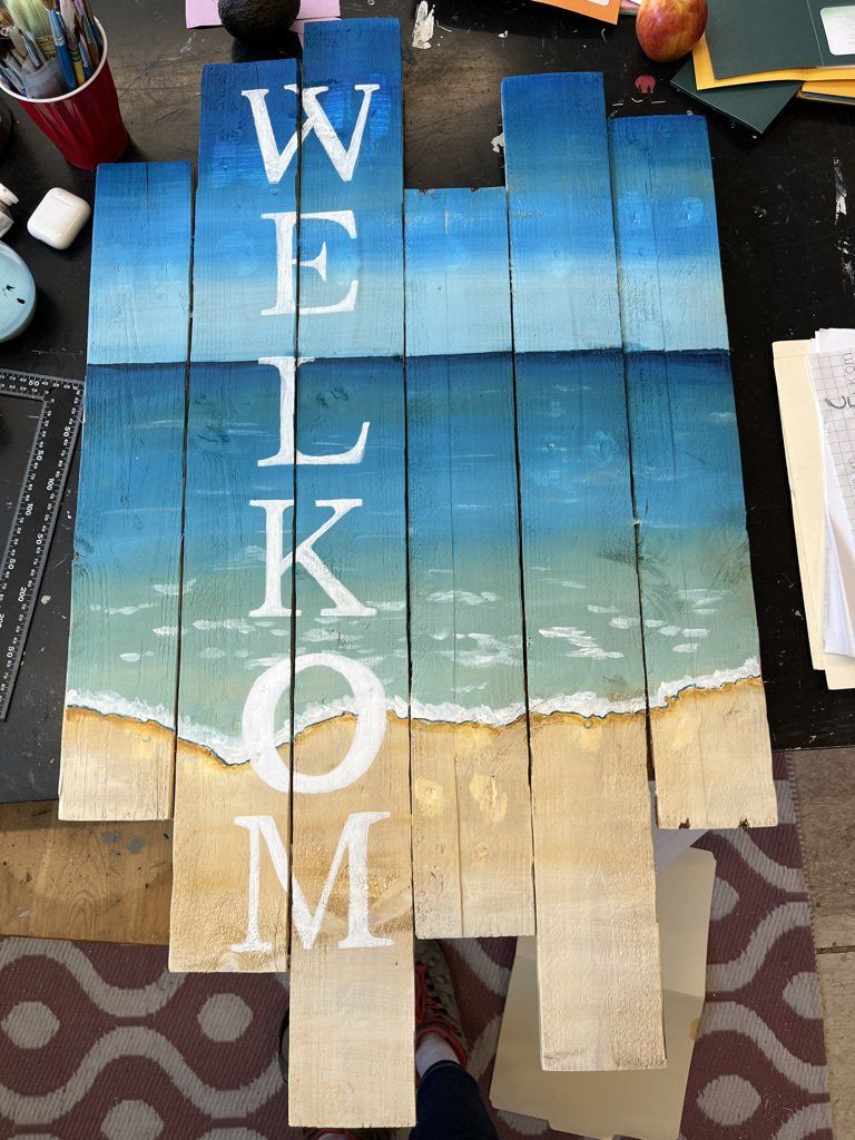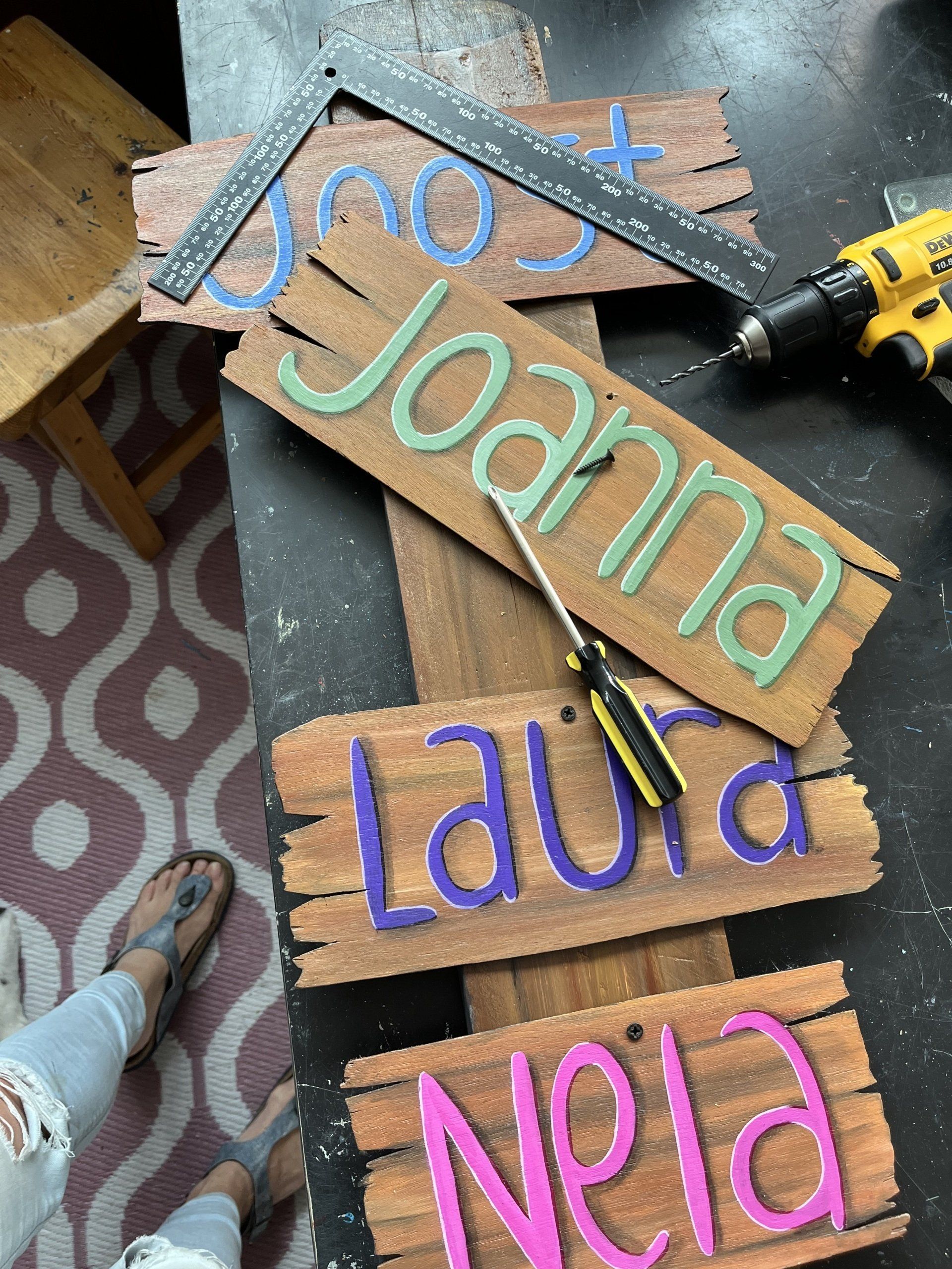 Na intensief overleg was het idee geboren om een soort van strandpaal te schilderen op het welkomstbord en de naambordjes erop te schroeven. Onderaan komt dan het bordje met WELKOM en daar tussen in een plekje om de wisselbordjes op te zetten. Want daar keken de kinderen helemaal naar uit!