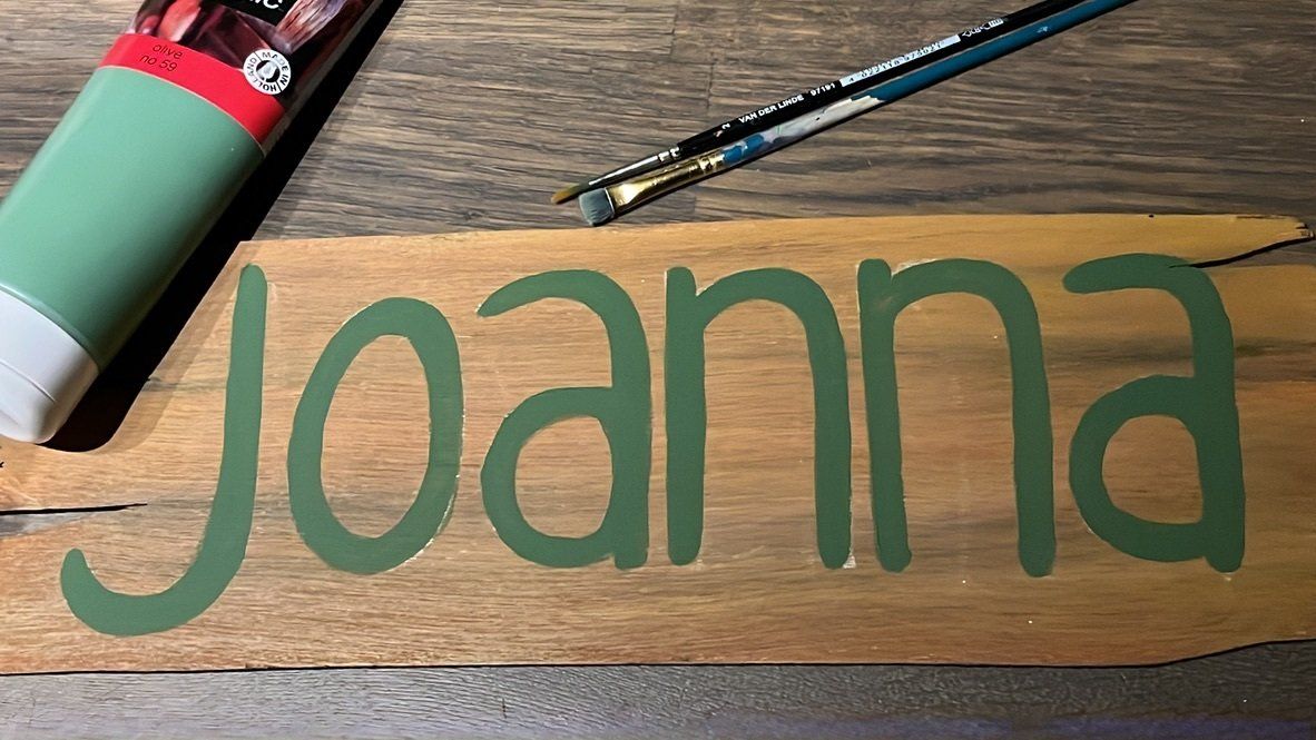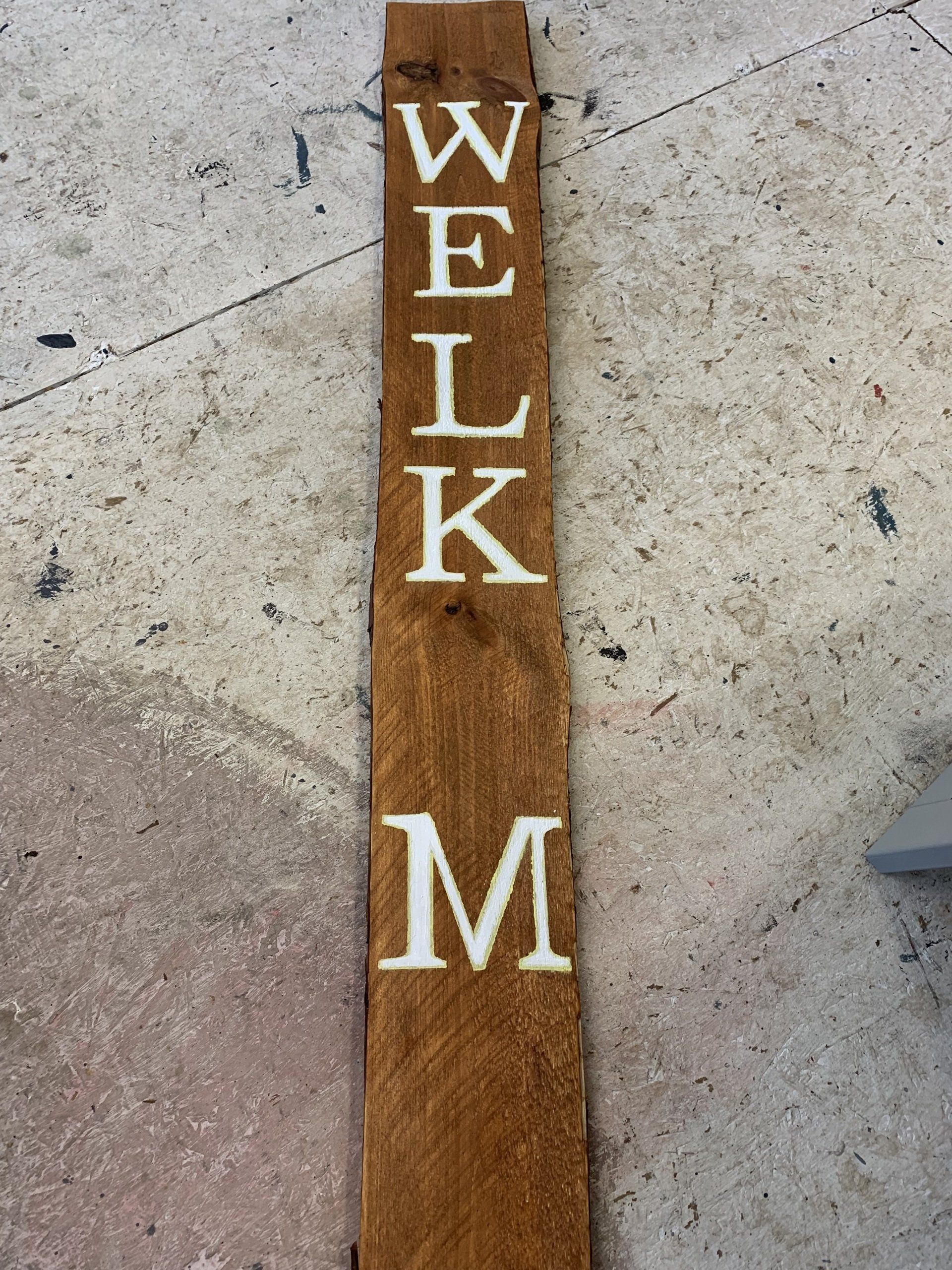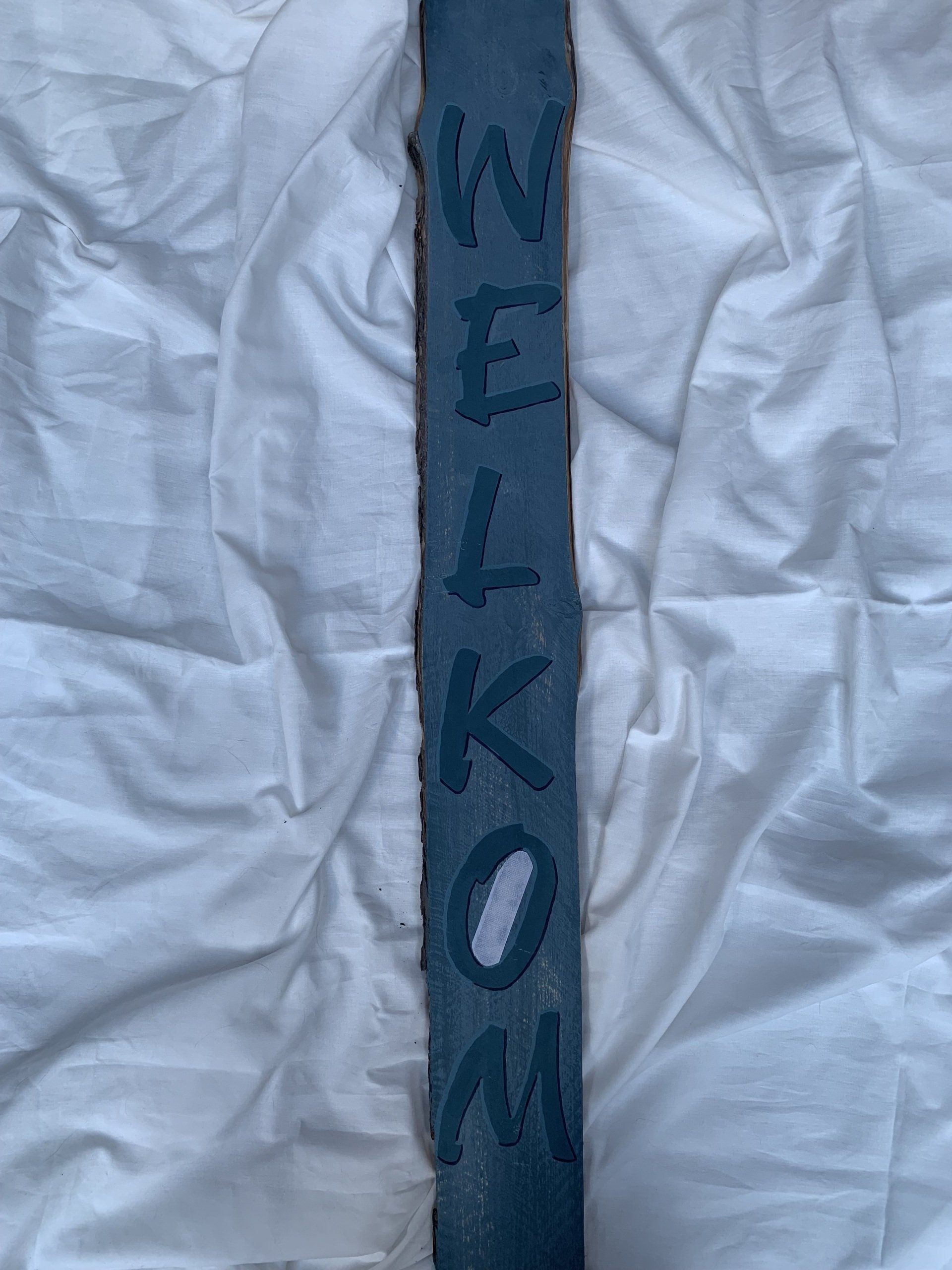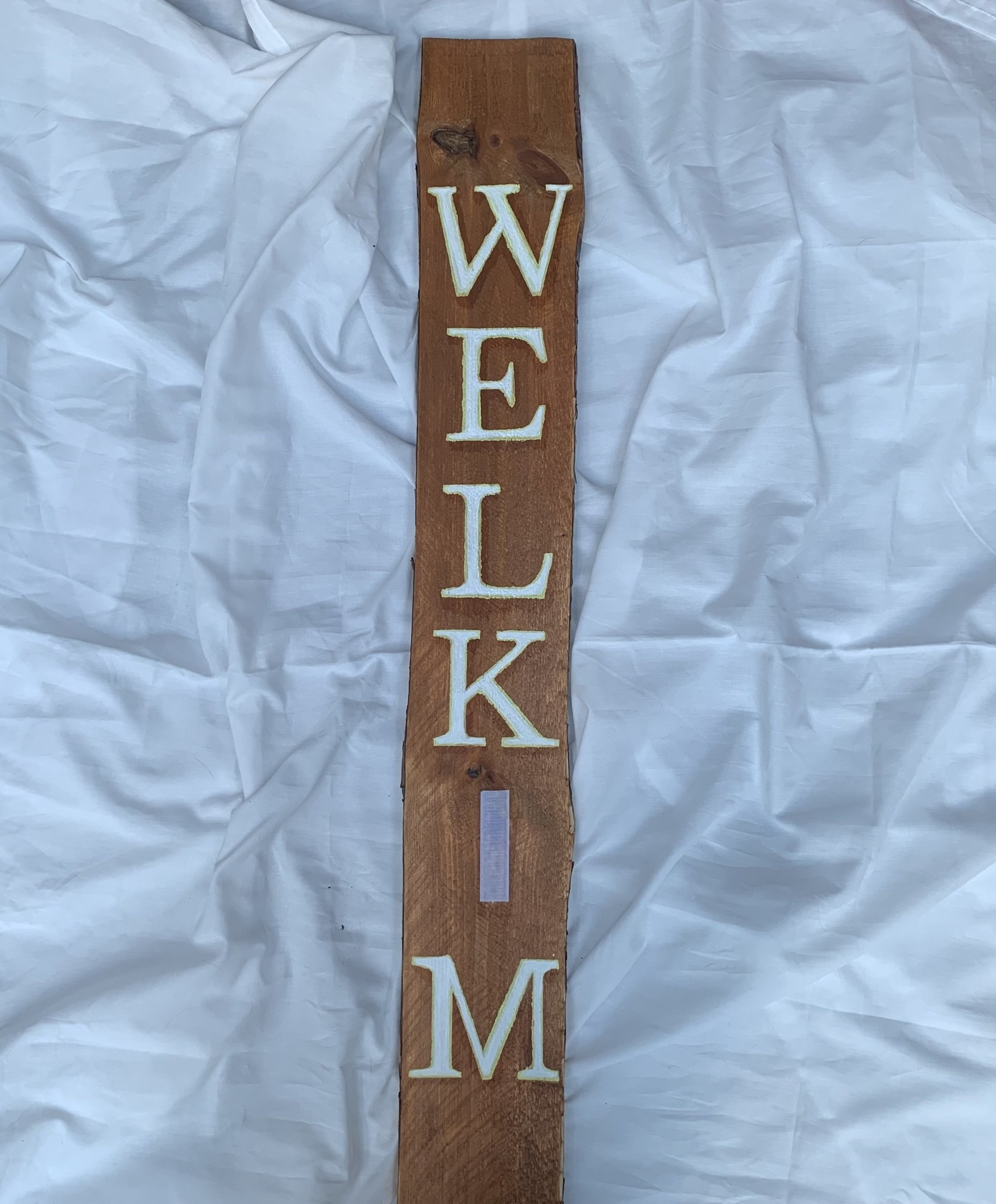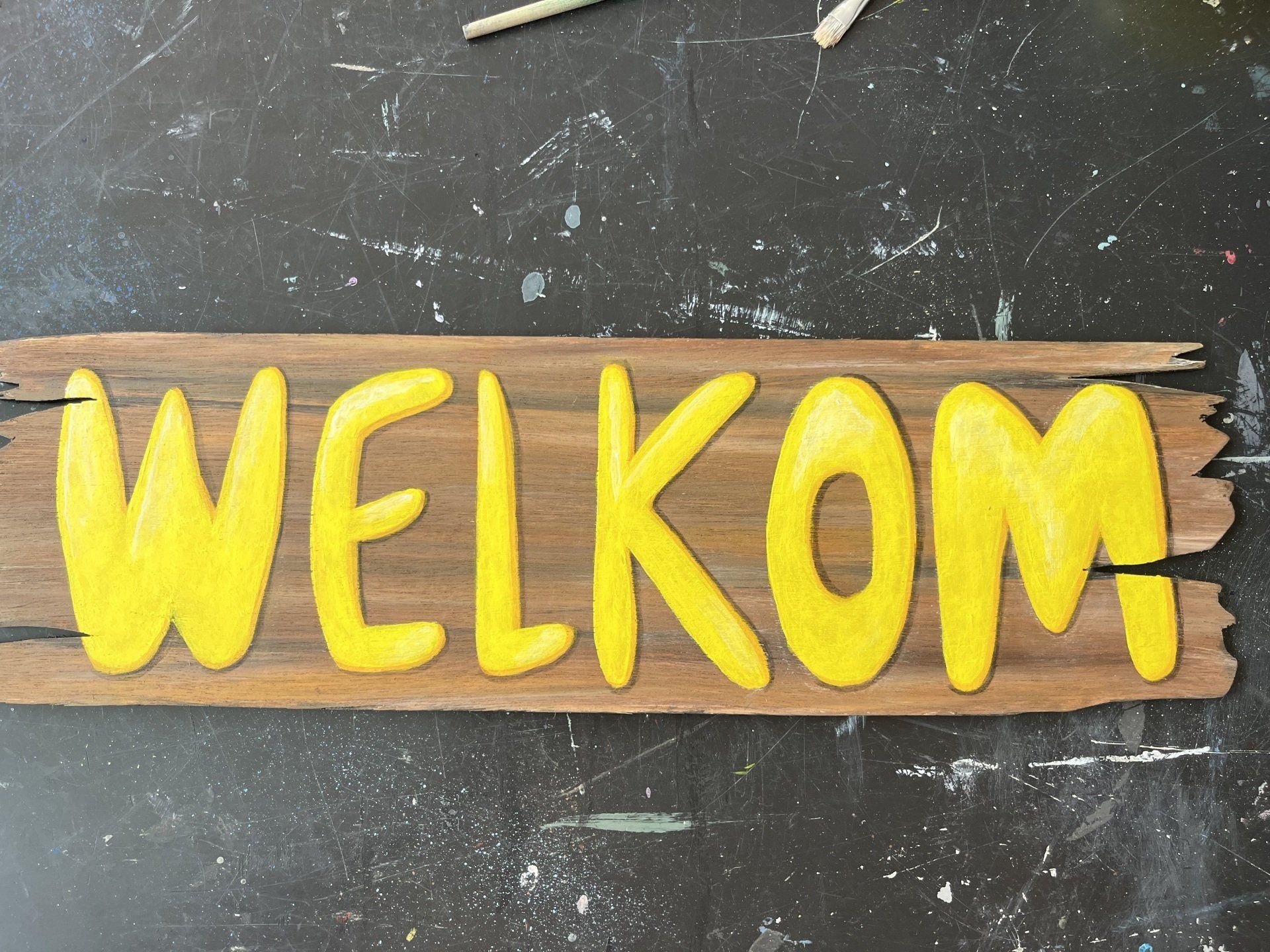 Hier overheen schilder ik dan met de hand het woord WELKOM is een klassiek lettertype en let eens goed op de O... het klittenband heb ik mee geverfd me de achtergrond! Gaaf geworden he?!