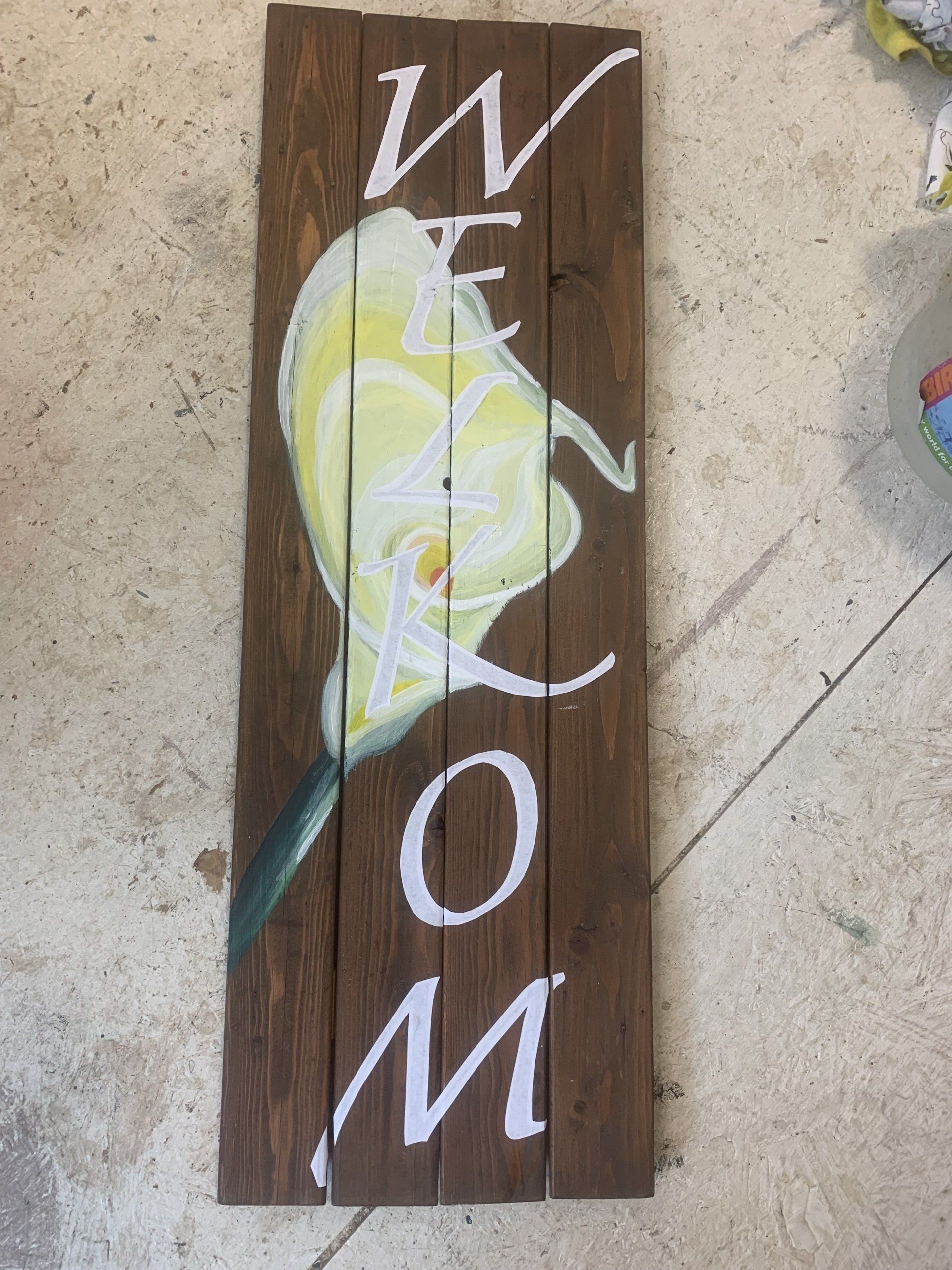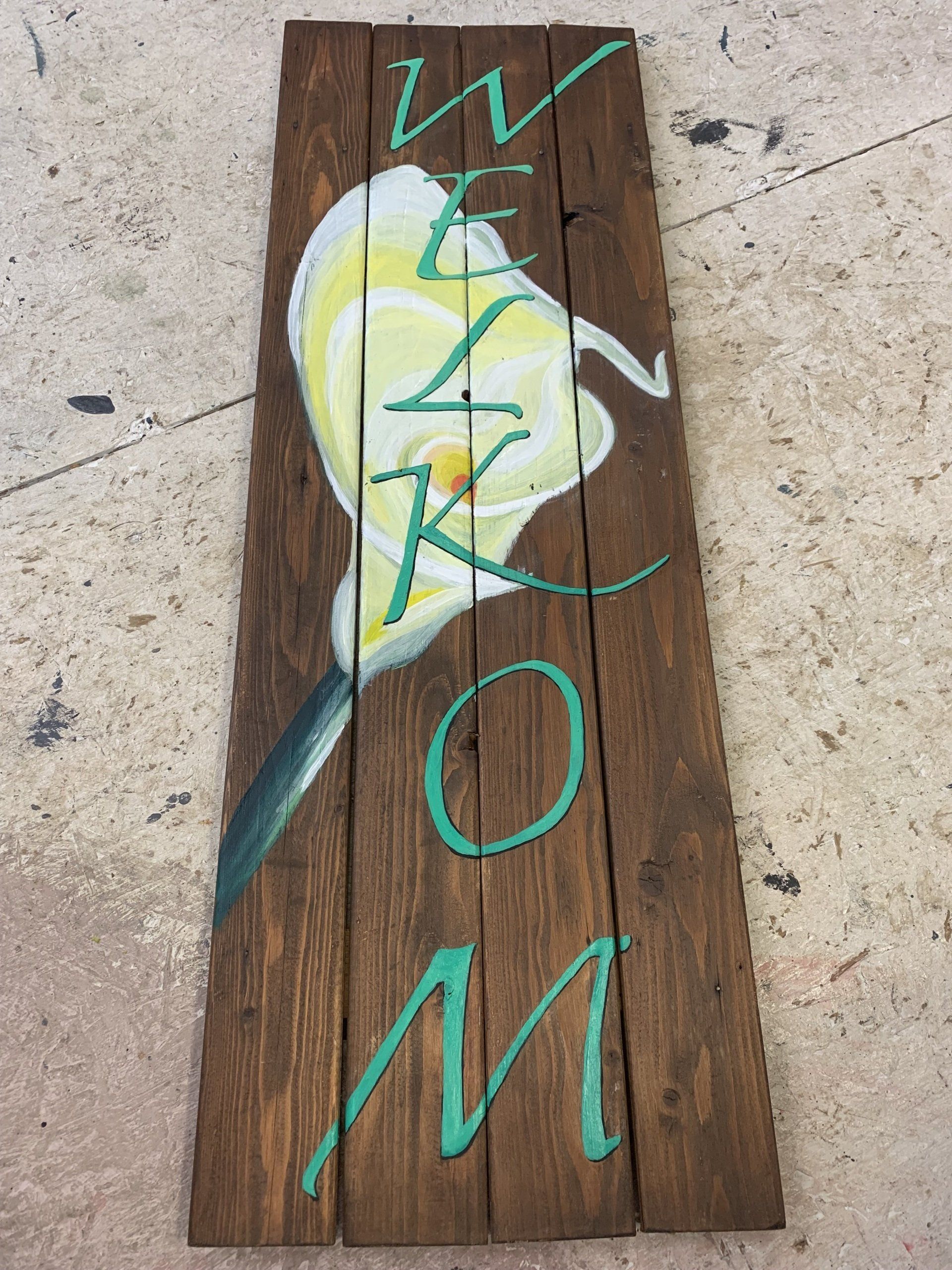 Hier zie je een prachtig WelkomstBord met een geschilderde lelie op de achtergrond. De sierlijke letter maakt het een stoer maar toch chique uiterlijk bord.