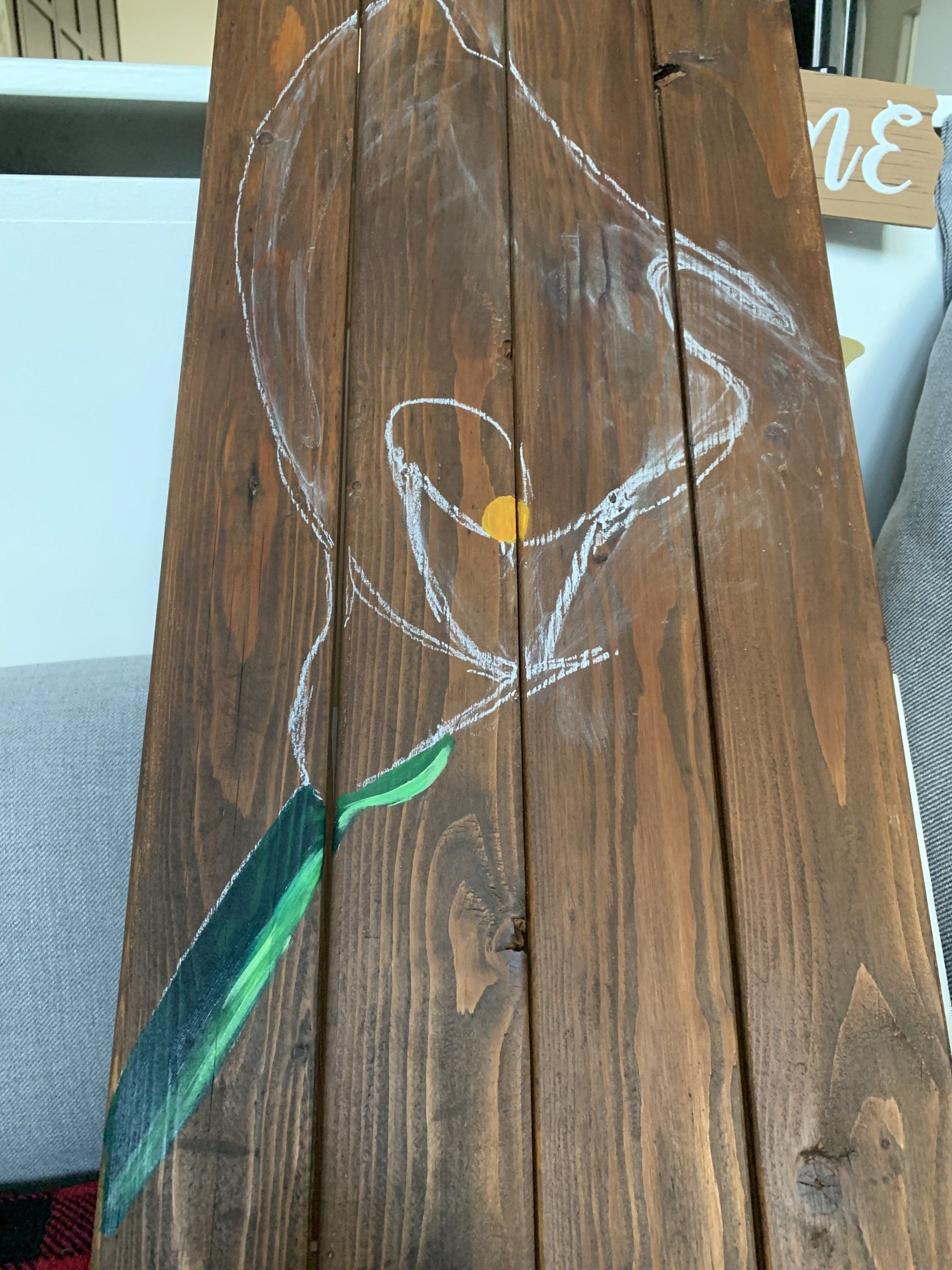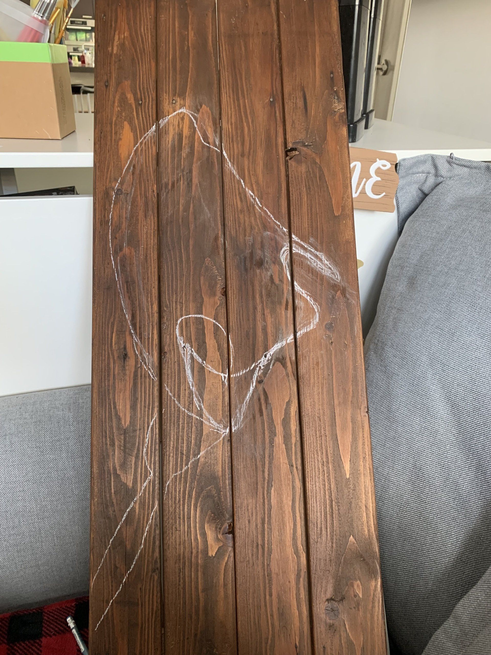 Dit bord is gemaakt van een palet. Zoonlief heeft een uur staan zweten om de planken netjes van elkaar te halen. Daarna heb ik een leuke combinatie gemaakt en stevig de planken tegen elkaar aan geschroefd. Uiteraard de gaten gevuld en schuren zodat het bord geen splinters meer heeft.