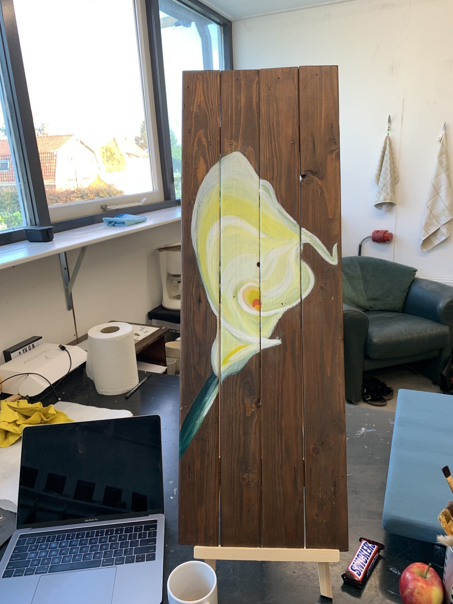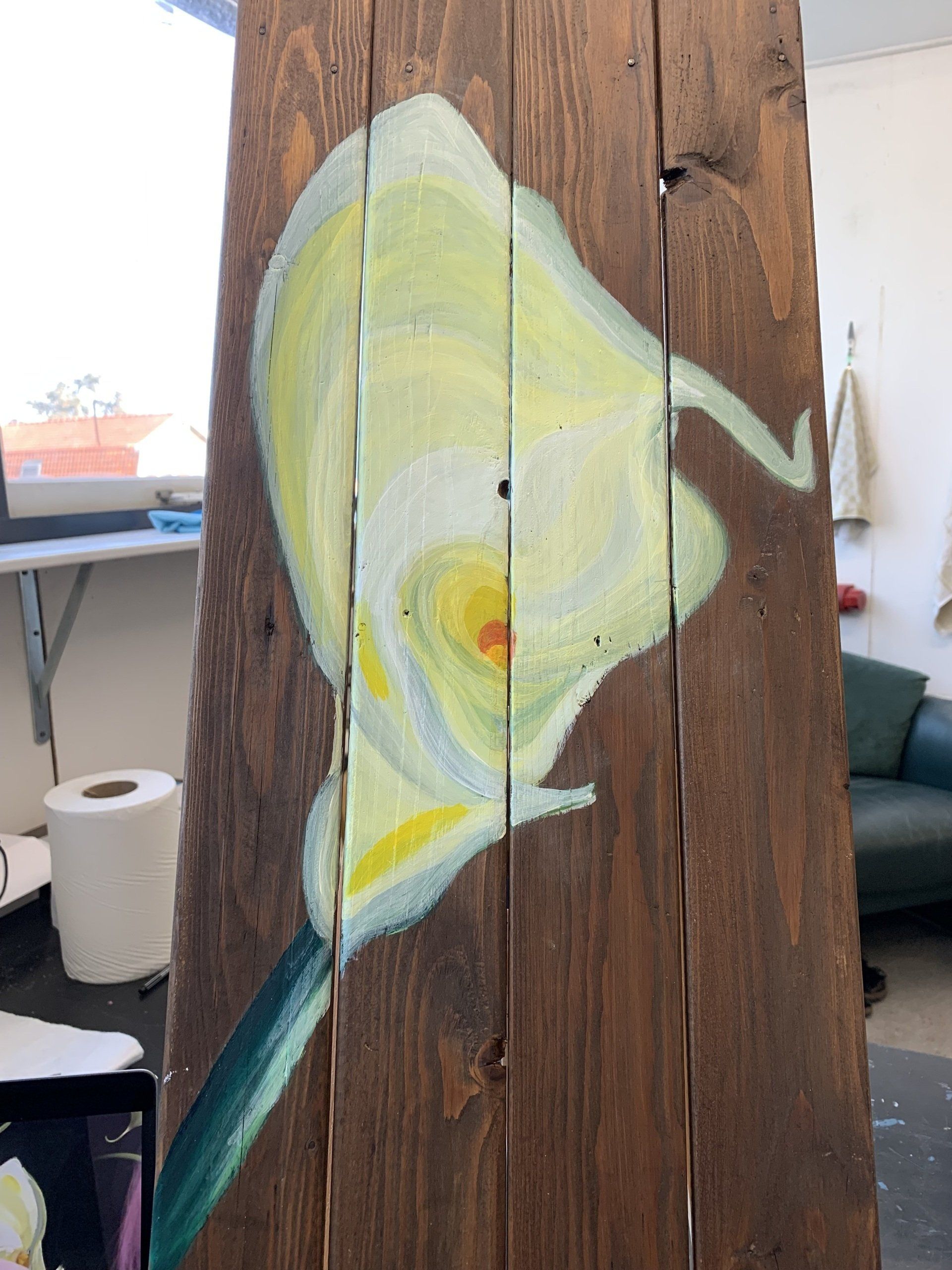 Daarna heb ik een mooie lelie uitgezocht en deze stap voor stap op de plankjes geschilderd met acryl verf
