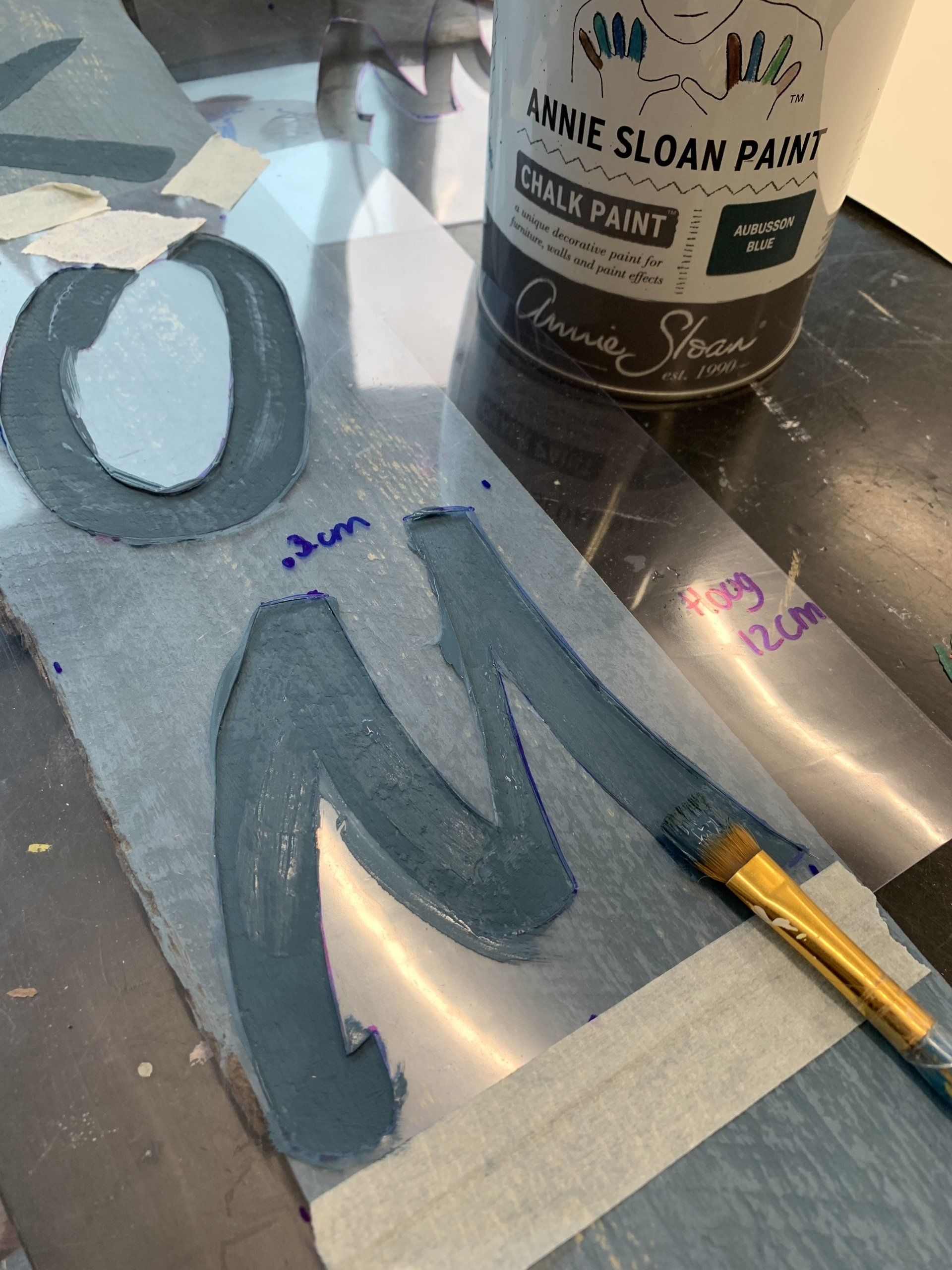 Een prachtige sierlijke letter is er heel secuur met de hand opgeschilderd, de schaduw maakt dat het net lijkt of de letters erboven zweven